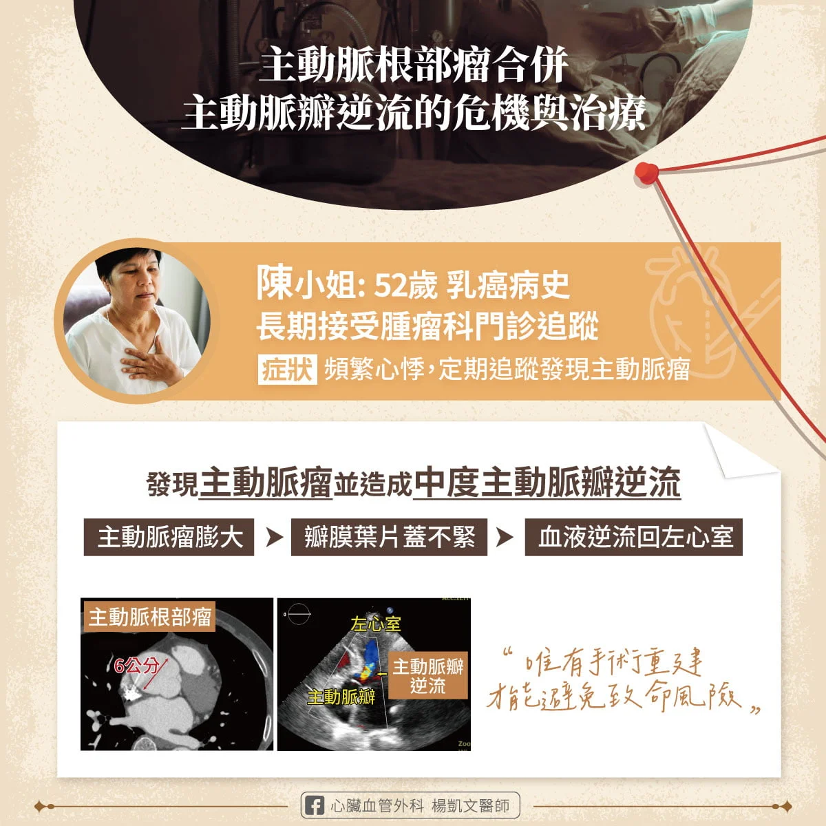 前些日子,我收到一般外科轉介一個乳癌的患者來到我的診間,那是一個52歲陳小姐,過去有乳癌病史長期都有在腫瘤科門診接受追蹤,最近因為頻繁心悸,同時在定期追蹤照電腦斷層時,意外發現升主動脈及主動脈根部有動脈瘤的情形,因此才被其他醫師轉介到我的診間,接受進一步評估及檢查。
