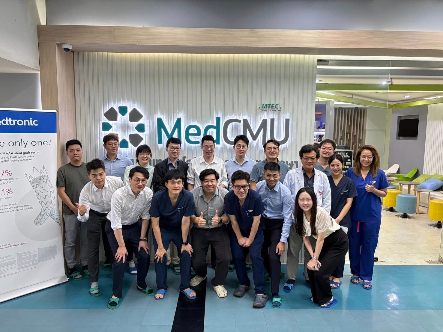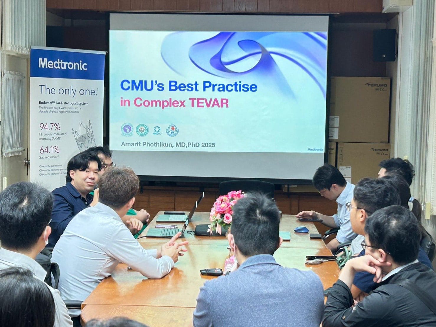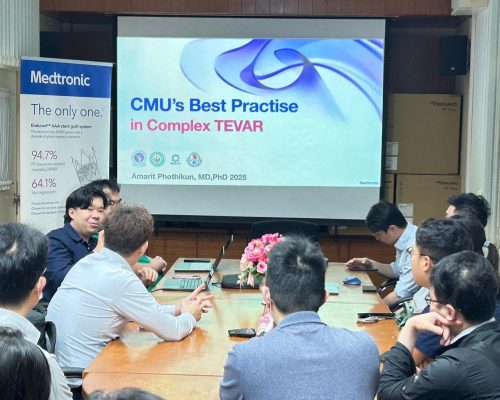近期動態清邁主動脈支架手術的交流 Posted by kelly 這幾日來到清邁大學附設醫院與泰國醫師進行為期3日的主動脈支架手術的交流。Dr. Chayatorn是泰國新生代的血管外科醫師,專精於PMEG(physician modified endograft),透過手工改造主動脈支架,讓更多不適合微創主動脈支架手術但又因手術風險過高不適合接受傳統開腹/開胸主動脈手術的病人可以保有另一個治療選擇。 這趟來除了偷學了一些手術的小撇步外,這趟也有機會結識來自台灣其他醫院的年輕/中生代的醫師,互相交流並發現自己哪裏可以做的更好,不枉此行!